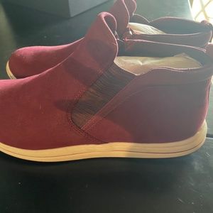 beautiful Clark booties in berry color. The material has a very smooth suede feel.