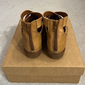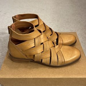 Tan booties with back zipper and lattice detail. All leather. Signs of wear on soles but heals are not worn uppers are clean. Original box included.