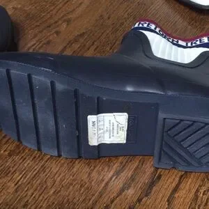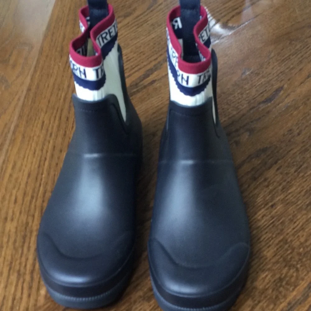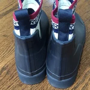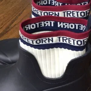Tretorn rubber booties excellent condition dark navy with stretch fabric in cream with burgundy and navy trim.