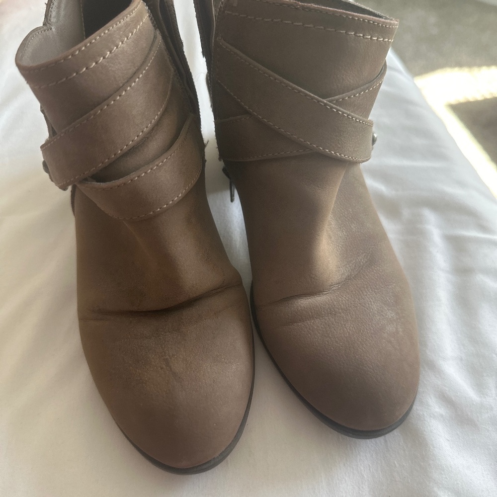 Suede booties with ankle zipper. Comfortable and versatile.