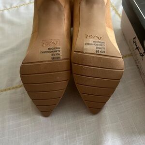 Brand new never worn. Size 8.5. Toffee suede color. 4” heel with pointed toe. Bottoms are non slip. Faux fur trim.