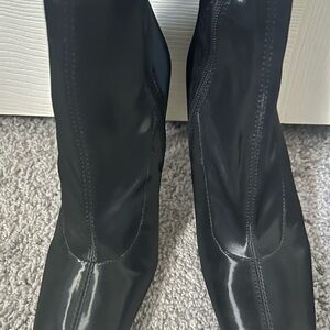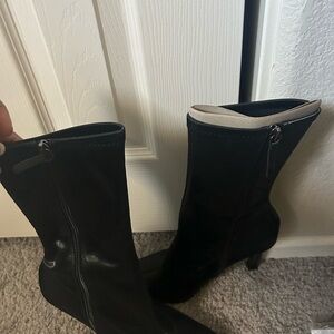 Never worn. Shift height is 9.25 in and shaft opening is 11 in. The opening has a little stretch. Side zipper. Silver heels. Heel height 4.25 in