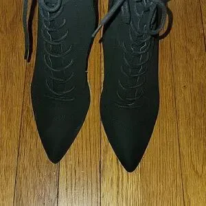Pointy tie lace up mid calf booties, faux suede material. 3 1/2 heel height, mid calf.