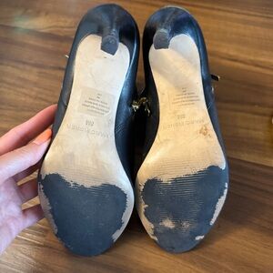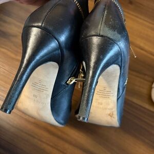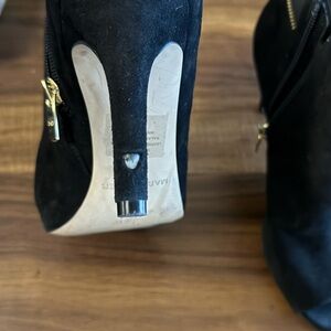 1. Black suede, gold zipper detail, shoe is still very black and in good condition, there is a gash on one heel (see pic)