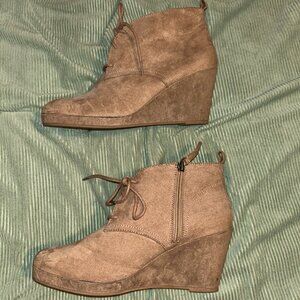 Dolce Vita brand, suede, tan heeled booties. Great condition, no major flaws. Zippers on inside of ankle and laces in the front. Does not come with box. Women's size 10.