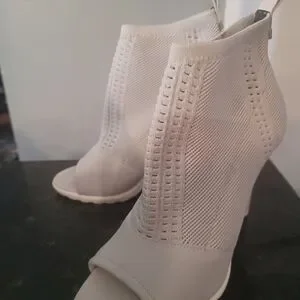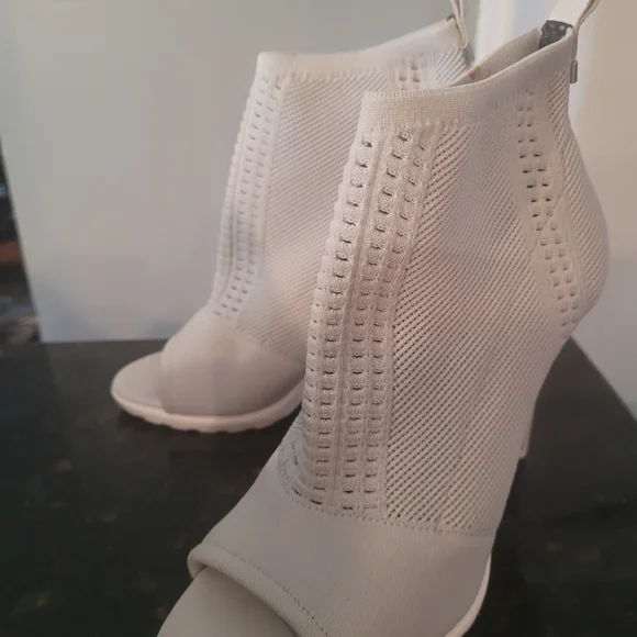 Chic gray and white knit peep-toe booties with a streamlined silhouette. Breathable knit upper offers flexible, comfortable wear. Elasticized ankle ensures a snug fit for all-day comfort. Stylish white finish pairs easily with casual and dressy looks.