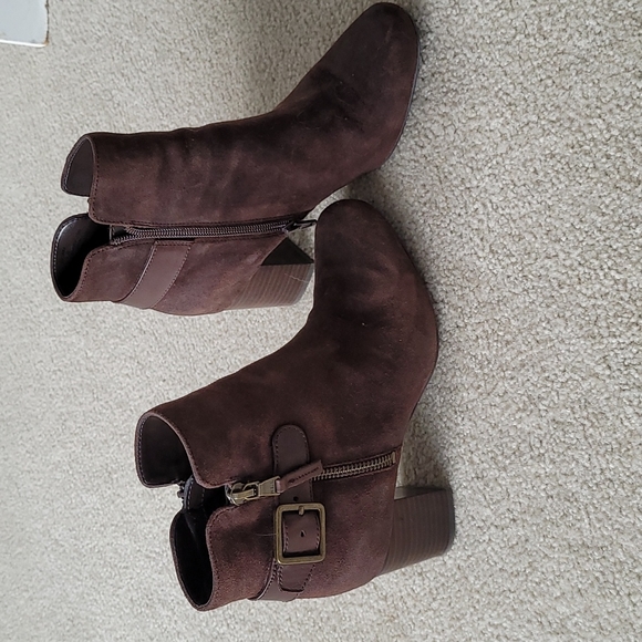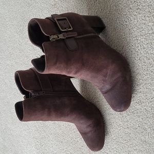 brown suede booties by Ralph Lauren. 2 1/2" block heel. Run narrow