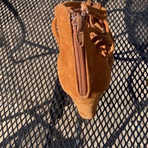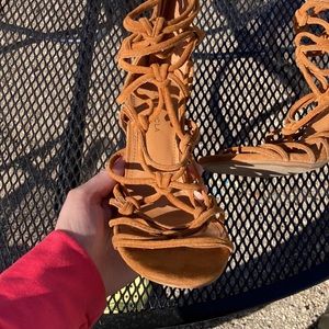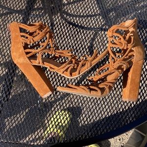 The whole heels are patter straps. Like a caramel brown color, worn a few times, in really good condition.