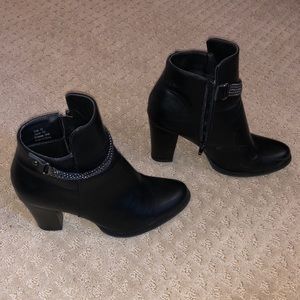 Cute simple booties with chain. They say size 10 but fit me (size 9-9.5). I think any 3 sizes would fit comfortably.