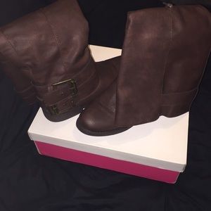 Boots that come up to your calf, pretty for the incoming fall season! The color is between brown and burgundy although the box says burgundy. New in the box.