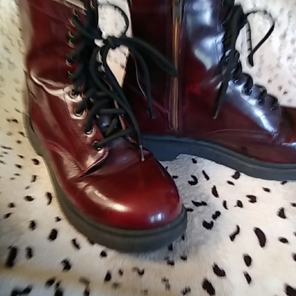 Combat boots, lace up, vinyl. Heavy lug soles great for rain, snow.