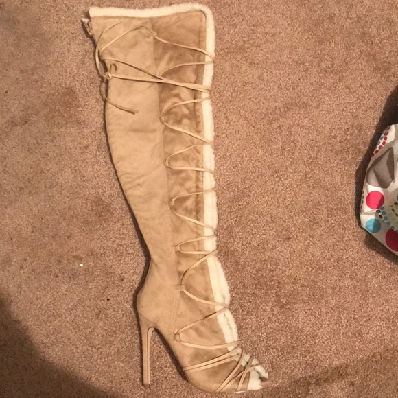 Tan, healed, over the knee food places at the front, fur on the inside