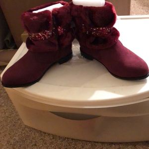 These are a brand new pair ofJoan Boyce boots. It never got cold enough in South Florida for me to wear They are a burgundy color with crystals on the side. The box says 7.5w so I must of ordered a wide. They also have zippers on the side of each boot. Very beautiful