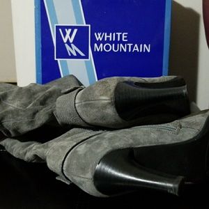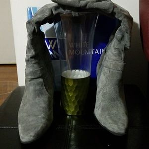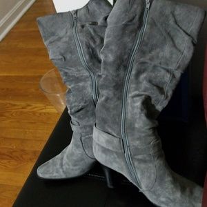 Cheeky charcoal gray suede boots that comes to the knee. About 16-1/2 length from knee to bottom of heel. Boots also can scrunch to low boots. EUC. I only worn them twice. Very comfortable no scuffs or stains on boots. They have a design belt around ankle part. A beautiful boot. Elegant and Versatile. Has av3-1/4 inch heel They are 17 inches around the calf