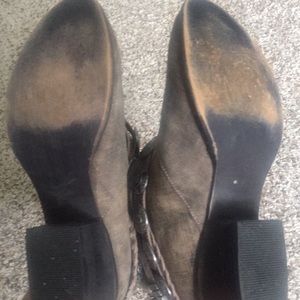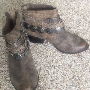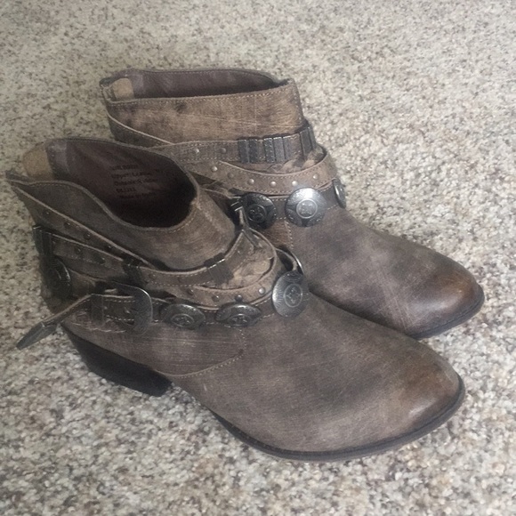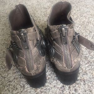 SUPER CUTE buckled booties! Zip up back. Lightly distressed...gray/brown color. Smoke free home:)