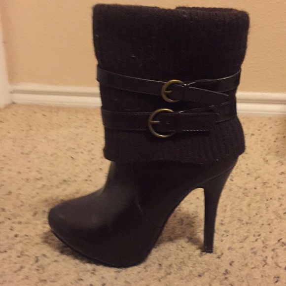 Boots with heels. Zip up on inner side and 2 buckles for looks on outside. Only wore a couple times. No scuffs Purchased at a boutique.