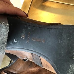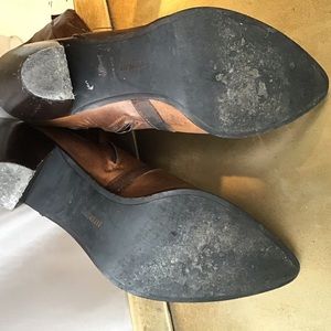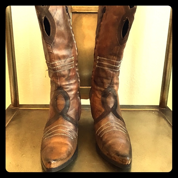Really lovely western boots that I bought in London made with very soft brown distressed leather with stitching detail , side zips and lined in leather . There is a little stitch that has come undone , it could easily be restricted by a good shoe mender