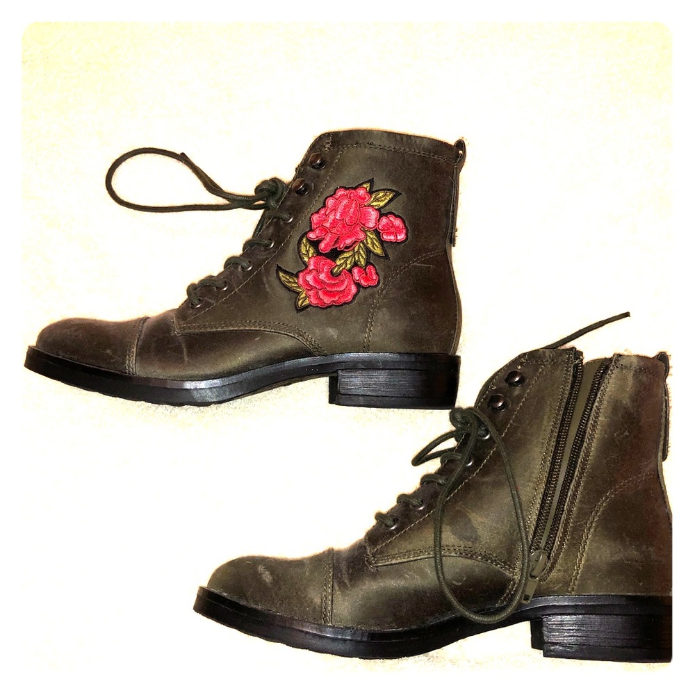 Green ankle boots with pink rose
