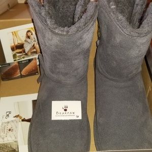 Charcoal colored waterproof sherpa lined winter boots.