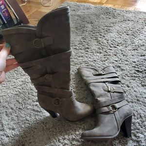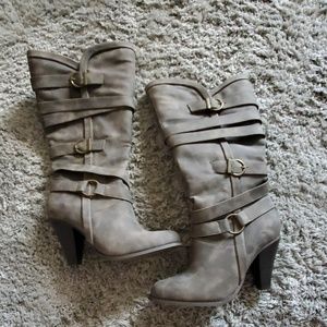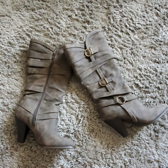Cute heel boots with gold buckles and a zipper on the opposite side.