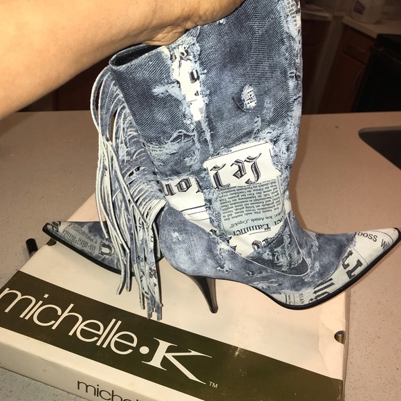 Mid calf boots with denim-ish look. Black heel & fringe. Gently worn.
