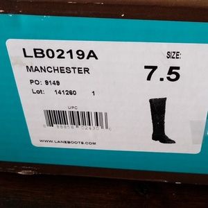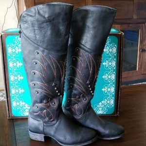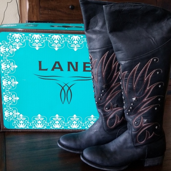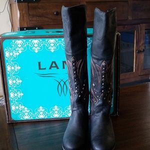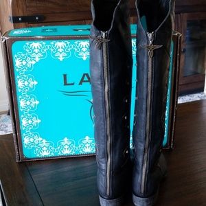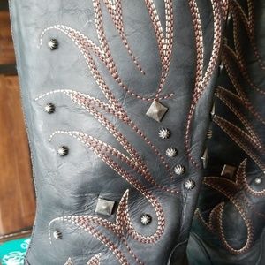 Knee high. Super dark brown could be black. Metal and stitching details.