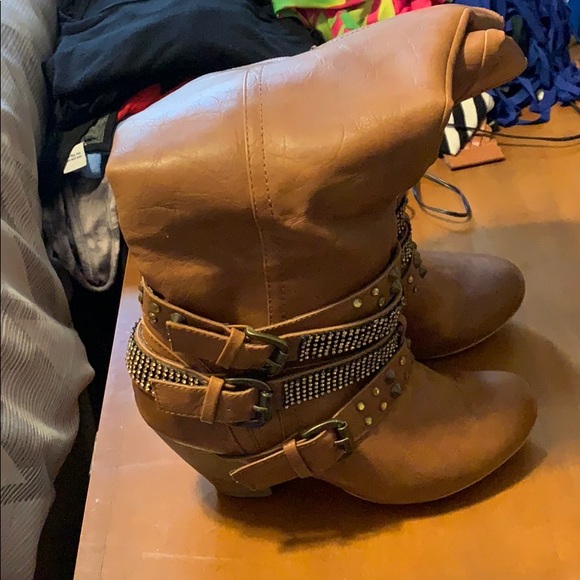 Orange -Brownish high boots with rhinestone and studs... A couple of the rhinestones are missing but not noticeable unless your really up on it... Small scuff on the right back heel but, other then that, their in very good condition....