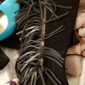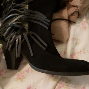Black suade reba with fringe going up the side with 2 inch heel