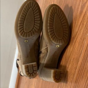 Distressed tan suede boot with brown leather buckle piece on top of boot.