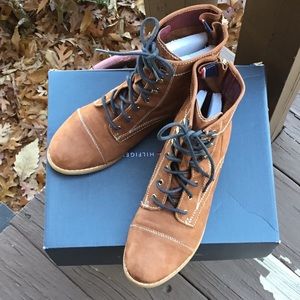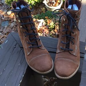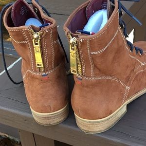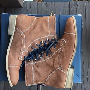 Light brown nubuck leather boots with navy blue shoe laces