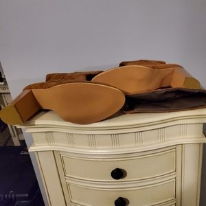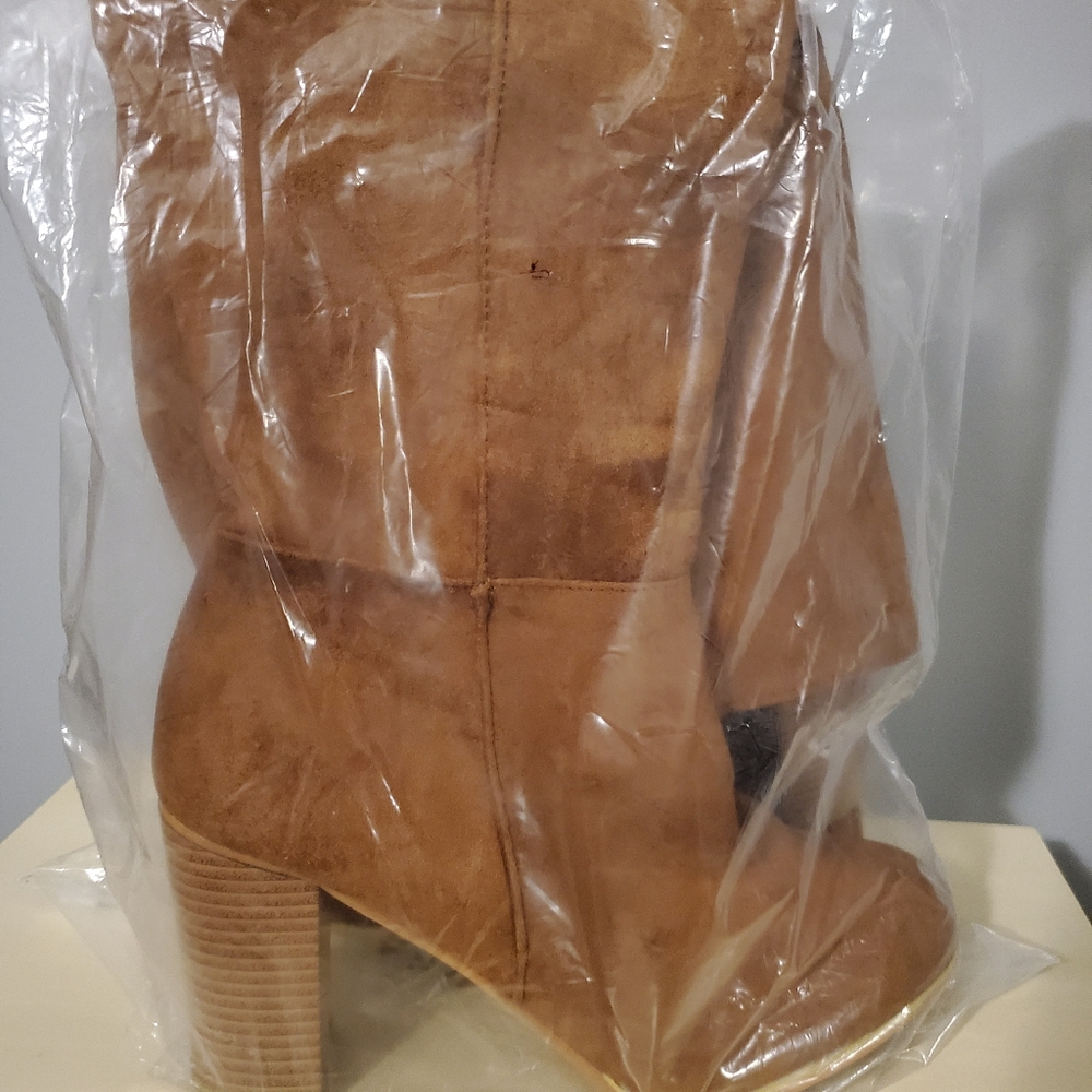 Brown sude wooden heeled boots. Never worn. Color is not what I expected.