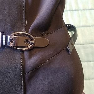2.5 inch heel. Stretch, zip up boots. Note 3rd pic flaw, nothing a little glue can't fix.