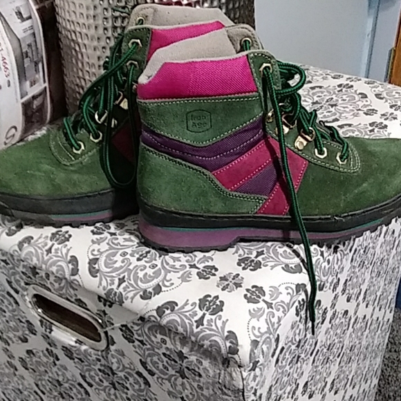 Green purple and pink boots.