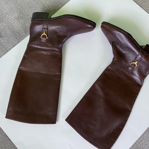 Leather boots -- lightly worn. Slip-on style (no zipper) and knee-high. Decorated with gold-plated buckles