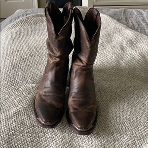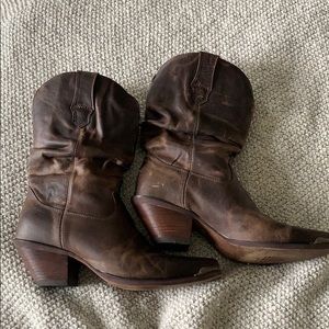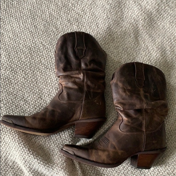 Beautifully distressed leather boots. Mid calf height. Slouchy “worn” look with a perfect silver metal toe accent. Only worn a few times. Non smoking home.