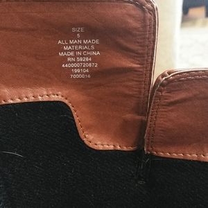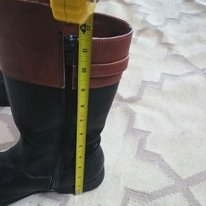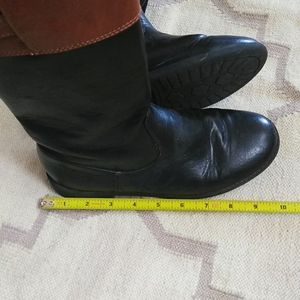 Black and tan riding style boots. All man made materials. Says size 5 but see photos for measurements. In good shape.