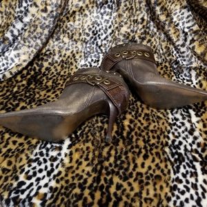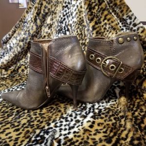 Gorgeous Antique look Brown Bronze Bootie accented with nice brown gator print buckle, inside zipper with awesome detail wooden heel. Gently used.