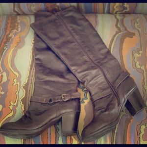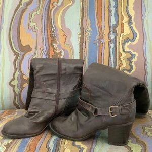 Size 8. A mixture of rustic browns. Leather. 2”-3” heel. Gently worn. A few scuffs on heels. Purely cosmetic, and can be freshened with polish and such. One of the pictures appears to depict a scuffed side of the boot near sole, but it’s glare. No brand legible.