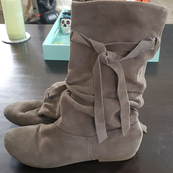 Suede off gray boots, scuffs and the front is coming apart on the right boot
