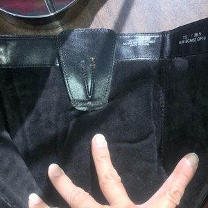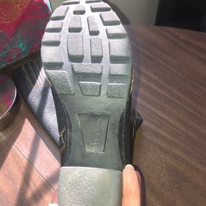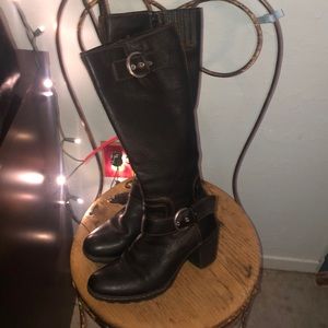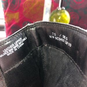 Below knee-hi black leather boots. Side zipper allows for easy boot removal. 2 inch heel with skid resistant bottom. The sole is flexible allowing for ease and comfort with the foots natural stride when walking and even running.