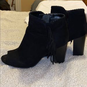 Open toed boots with fringe down the side. Gently used, couple scruff marks