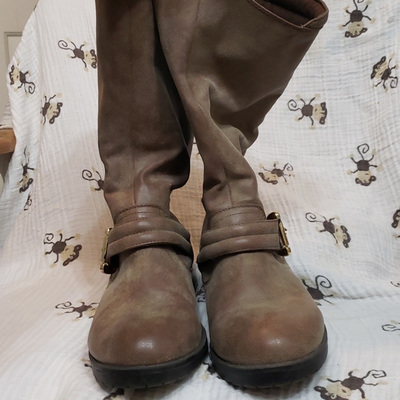 Just Fab boots size 7, a red line detail alongside the faux zipper on the back, gold detail on buckles. Barely worn and only one little scuff pictured above