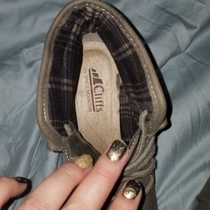 These boys have never been worn. Perfect condition. They are size 8M and a brownish grey color. Cliffs by White Mountain