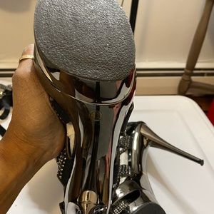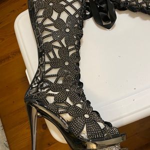 Size 10 very sexy Black & rhinestone boots. The boots go up to the knee. 4.5” heel. When you walk in the room all eyes on you. (the shoe that is) I really hate to sell them I love them so much. 😭😫 I’m only getting rid of them because I can’t do the heels no more. My loss your gain so please give them a good home. My price is FIRM!
