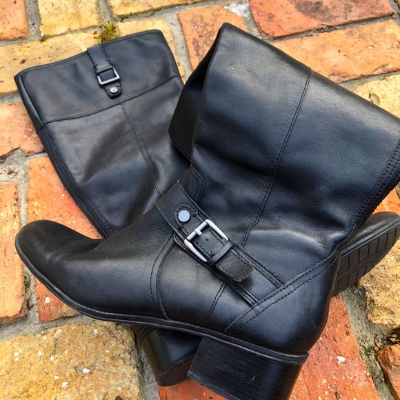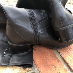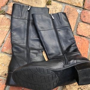 GUC Boots. Leather upper. Very few scuffs along toes and heels. Zippers work fine without issue. Perfect time for these leather upper boots. 1.5” heel. Heel to top of shaft is 17”. With boot zipped, top of shaft is 8.5”across laying flat.