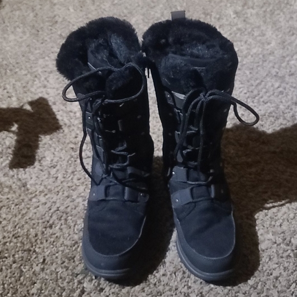Black winter boots with fur inside very lightweight and front straps up with zipper on side ...they are size 6 but fit more like a 7