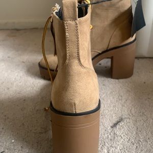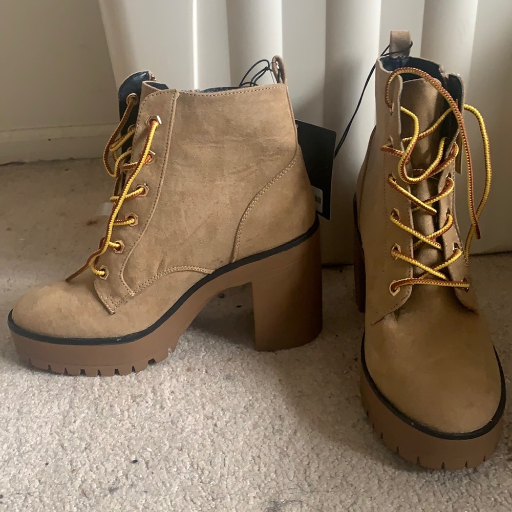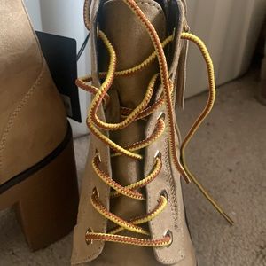 Tan boots with yellow and brown laces