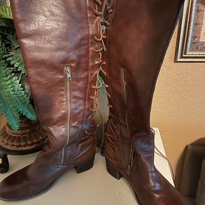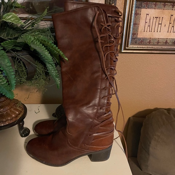 Super cute boots with laces in the back. Zipper for easy on and off. EUC