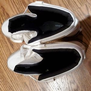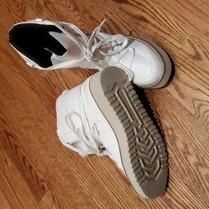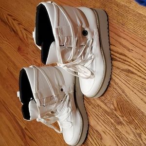 Calvin Klein cream color soft lightweight boots are in excellent condition. Beige soles with highlighted stitching, Calvin Klein logos located inside & outside of the boots. Inside lining in excellent condition. Extra long laces. These boots are versatile. Great for fall or winter.