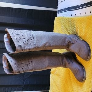 Jellypop boots, used, in good shape, some wear on soles. No stains or rips. These boots get a lot of comments! They are knee high. Color is light brownish/taupe.